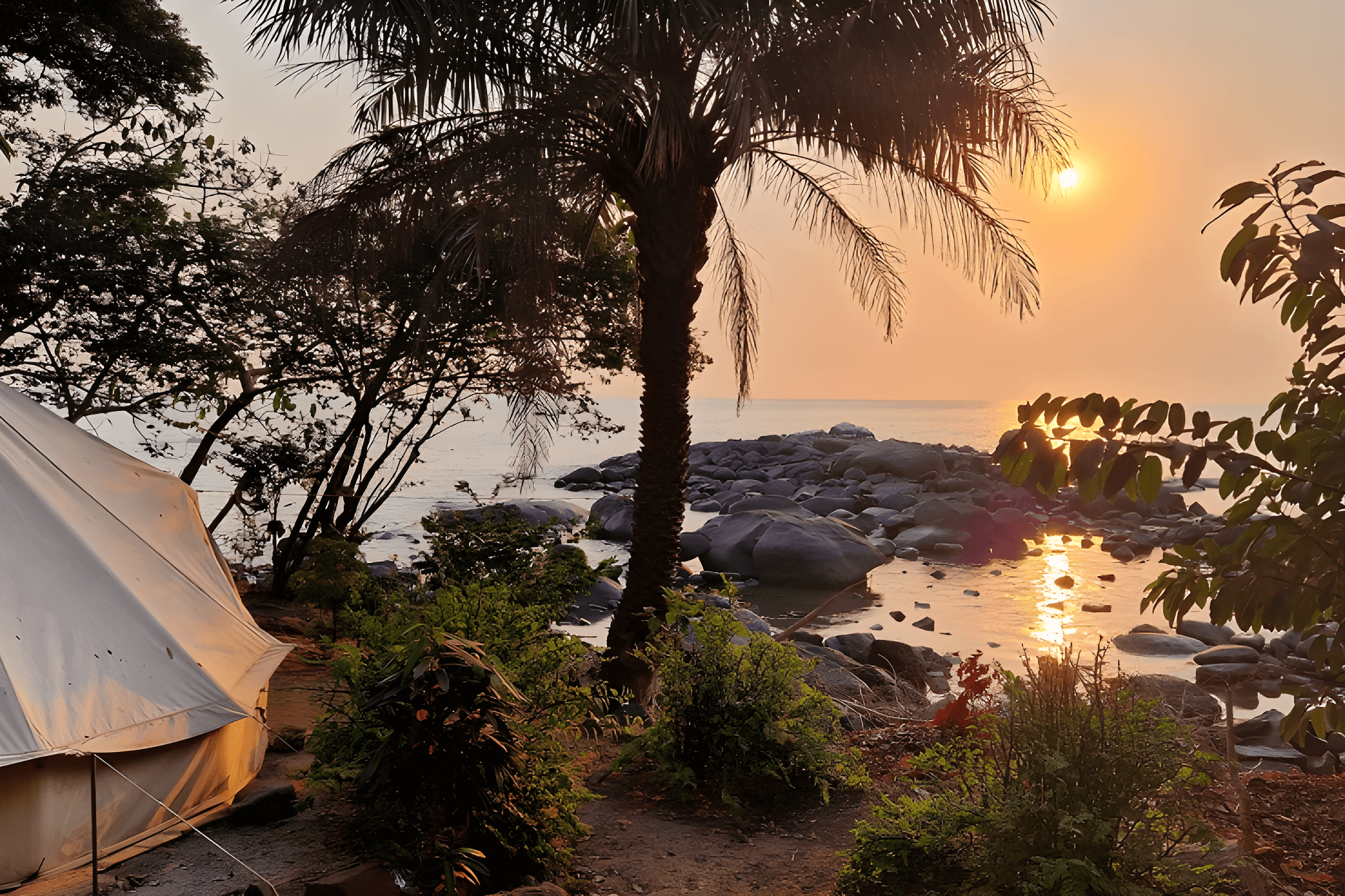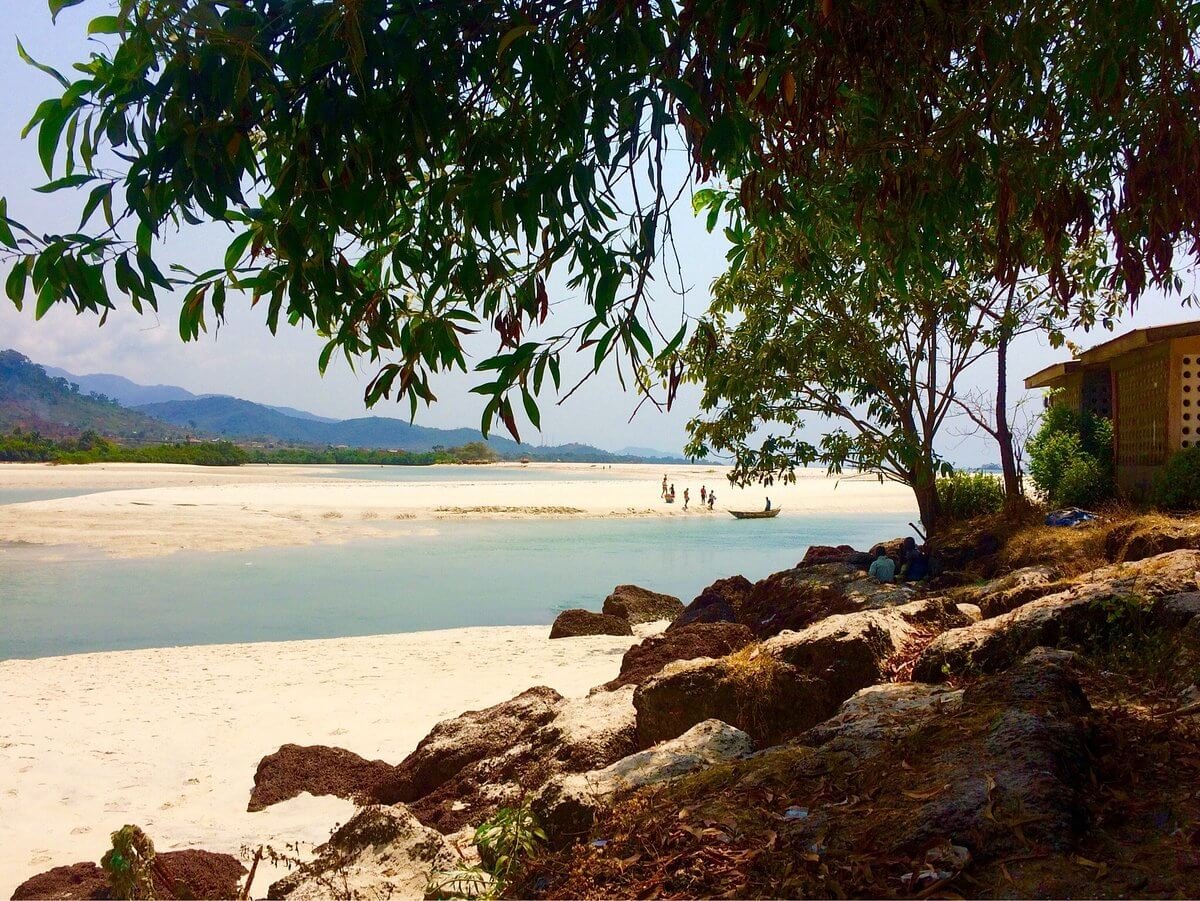 A little corner of paradise, a white powdery beach fringed by palm trees, where the emerald waters of a river meet the turquoise Atlantic Ocean.